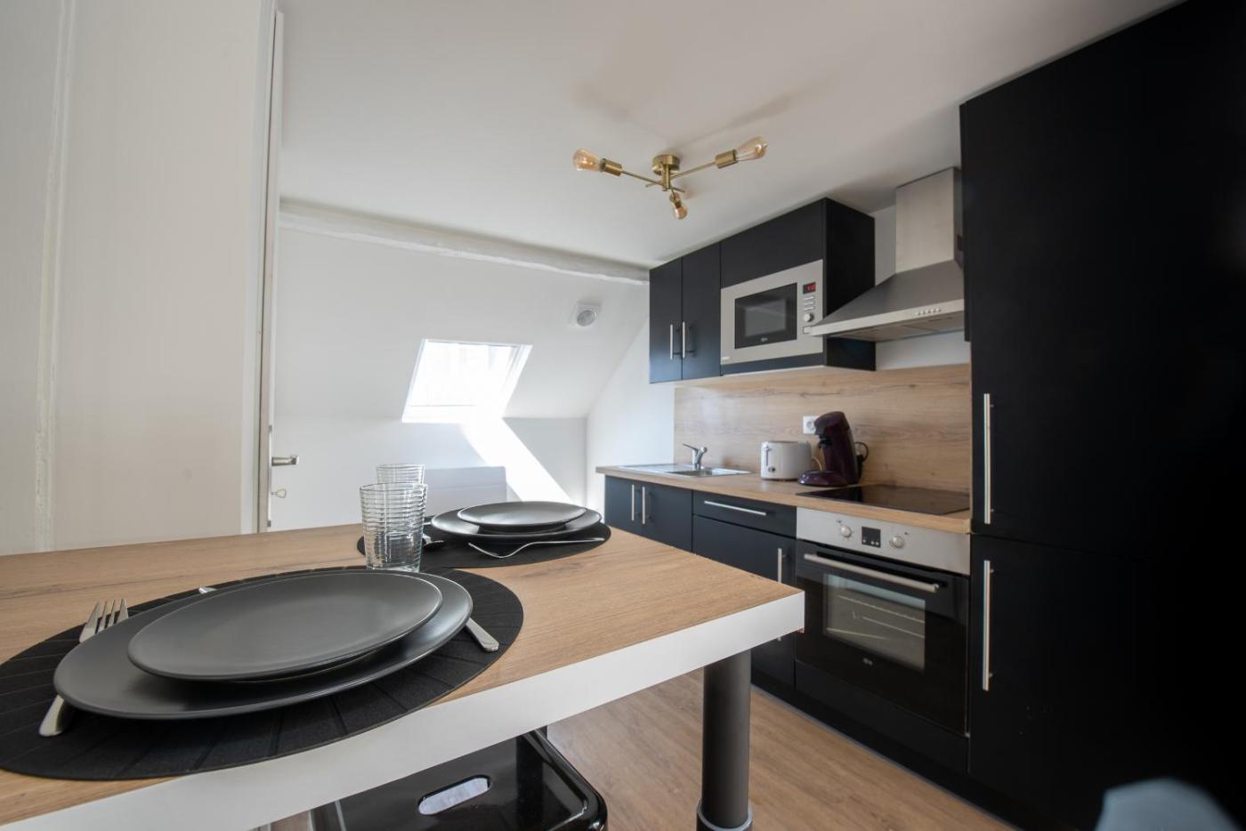 Appartement en Duplex. Boasting a private entrance, this apartment also comes with 1 bedroom, a seating area and 1 bathroom with a walk-in shower and a hairdryer. The well-fitted kitchen features a stovetop, a refrigerator, kitchenware and an oven. This apartment has a washing machine, flat-screen TV with streaming services, city views, as well as chocolate for guests. The unit has 1 bed. ;