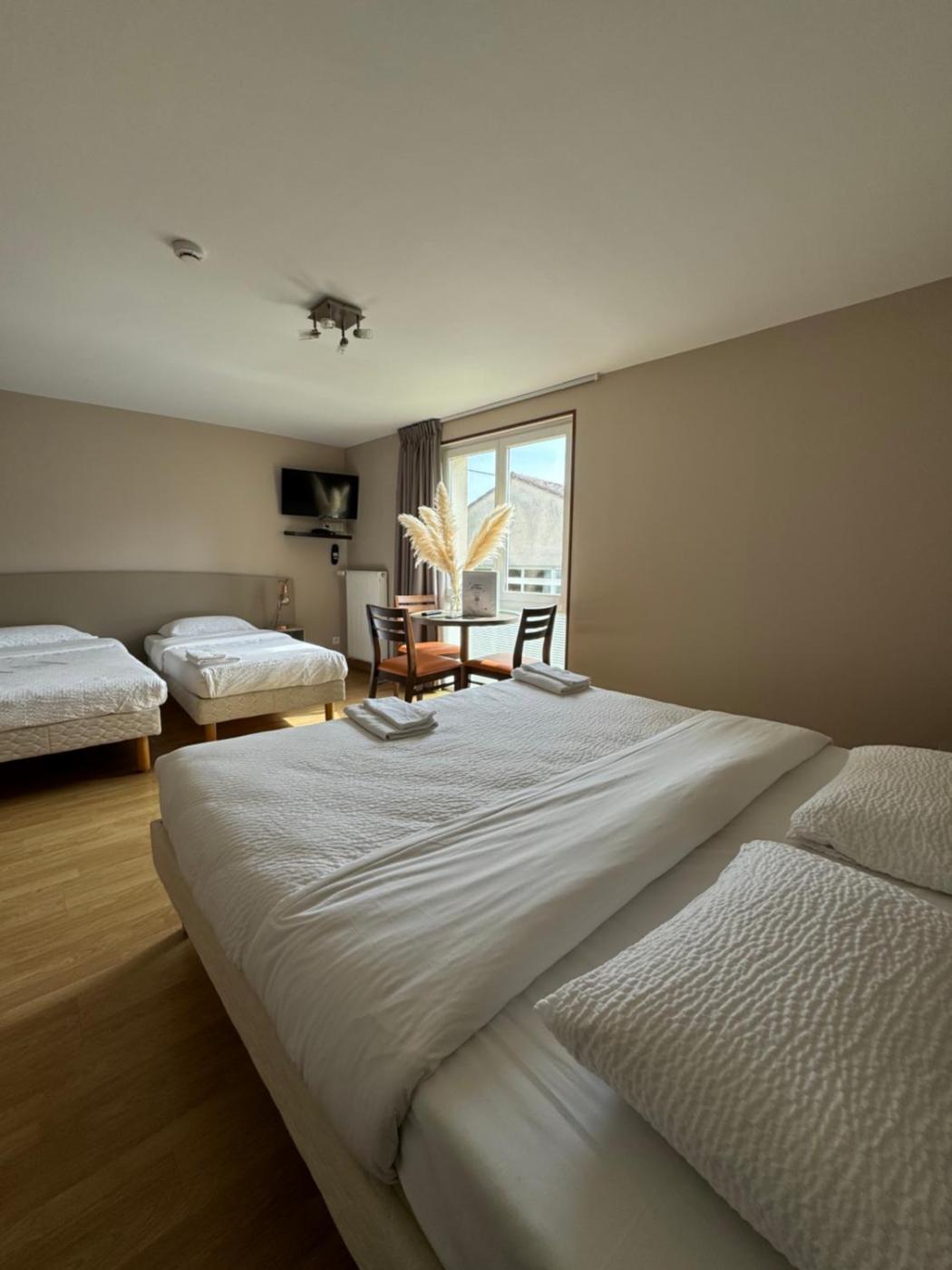 Chambre Quadruple Confort. This quadruple room features a pool with a view, hot tub and sauna. Featuring free toiletries, this quadruple room includes a private bathroom with a walk-in shower and a hairdryer. The quadruple room features a flat-screen TV with streaming services, soundproof walls, a dining area, an electric kettle as well as garden views. The unit has 3 beds. ;