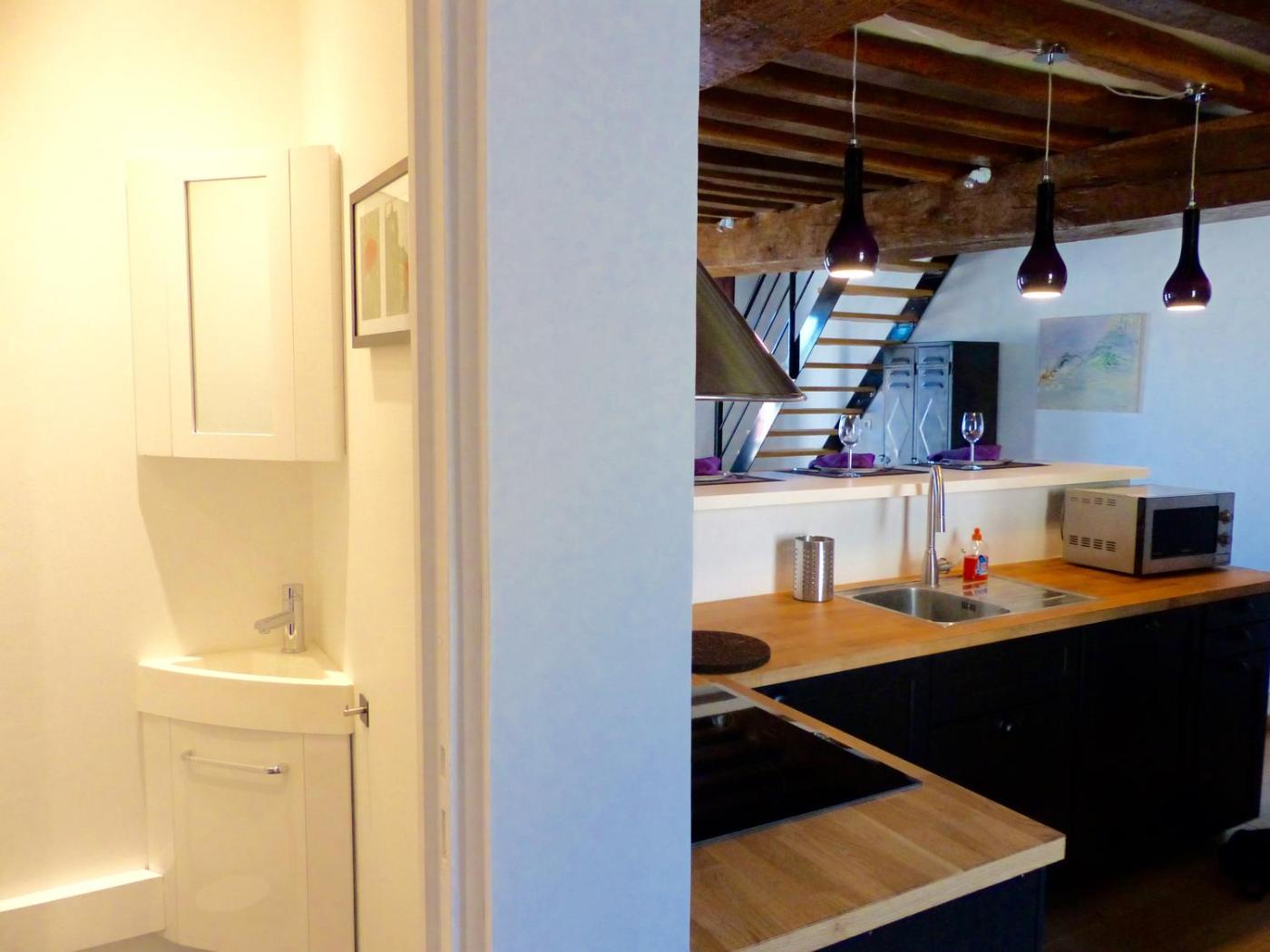 Appartement 1 Chambre. Cet appartement en duplex comprend au niveau inférieur un canapé-lit ainsi qu’une cuisine américaine entièrement équipée incluant un four, une cuisinière et un lave-vaisselle. La chambre et la salle de bains de style atelier se trouvent à l’étage.