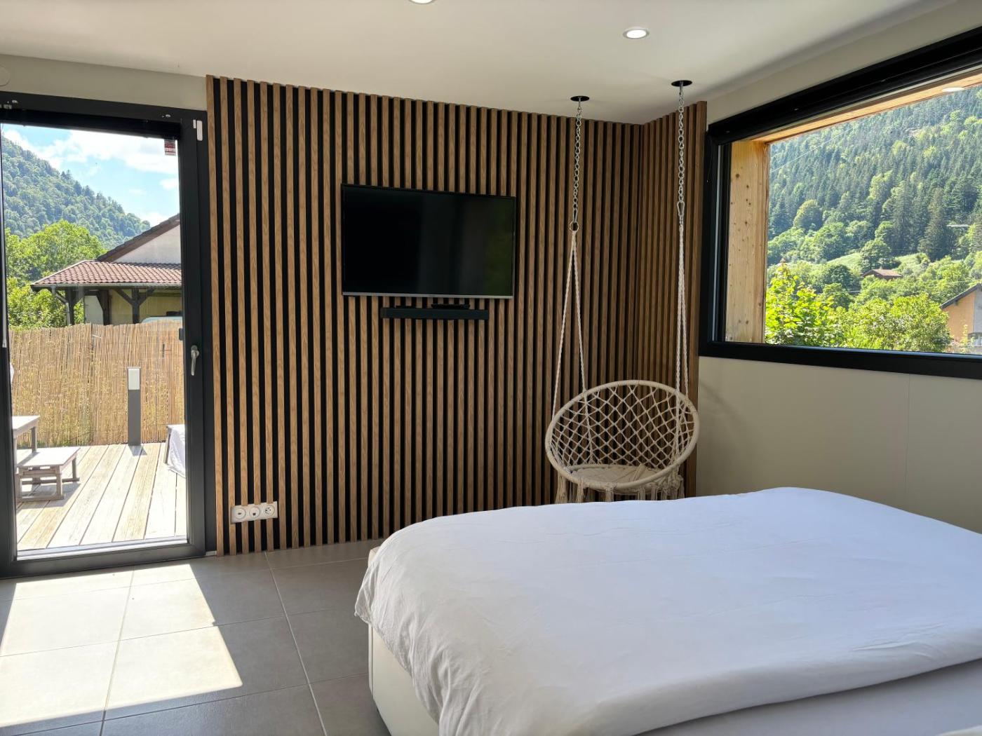 Chalet 2 Chambres. This chalets standout feature is the hot tub. This spacious chalet is comprised of 1 living room, 2 separate bedrooms and 2 bathrooms with a walk-in shower and a bath. Guests will find a stovetop, a refrigerator, a dishwasher and kitchenware in the well-equipped kitchen. The chalet also has a barbecue. Featuring a terrace with garden views, this chalet also offers a private entrance and a flat-screen TV with streaming services. The unit offers 5 beds.