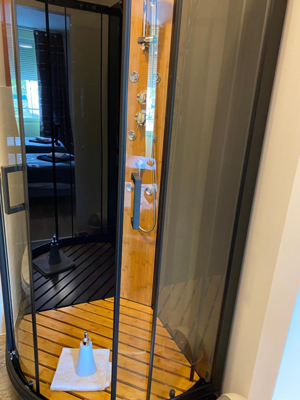 Chambre Familiale avec Douche. Providing free toiletries, this family room includes a private bathroom with a walk-in shower and a bath. The family room provides a flat-screen TV, a wardrobe, an electric kettle, a sofa as well as city views. The unit offers 3 beds.