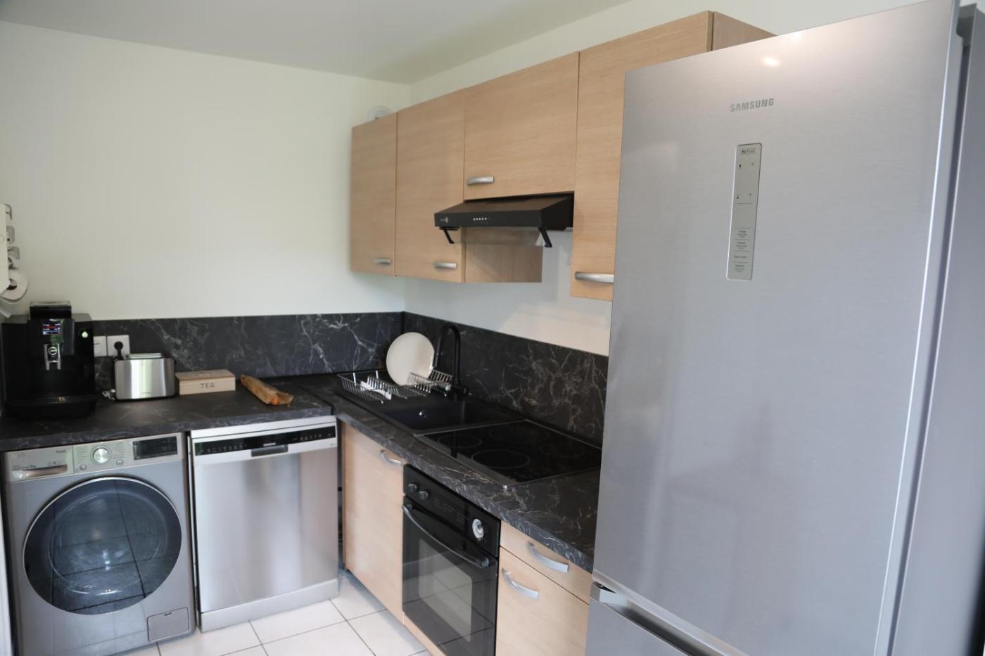 Appartement 2 Chambres. Cet appartement spacieux comprend 1 salon, 2 chambres séparées, ainsi que 1 salle de bains avec une baignoire et des articles de toilette gratuits. Vous pourrez préparer vos repas dans la cuisine équipée de plaques de cuisson, d’un réfrigérateur, d’un four et d’un lave-vaisselle. Doté dun balcon offrant une vue sur la ville, cet appartement dispose également dun lave-linge et dune télévision à écran plat avec service de streaming. Ce logement comprend 3 lits.