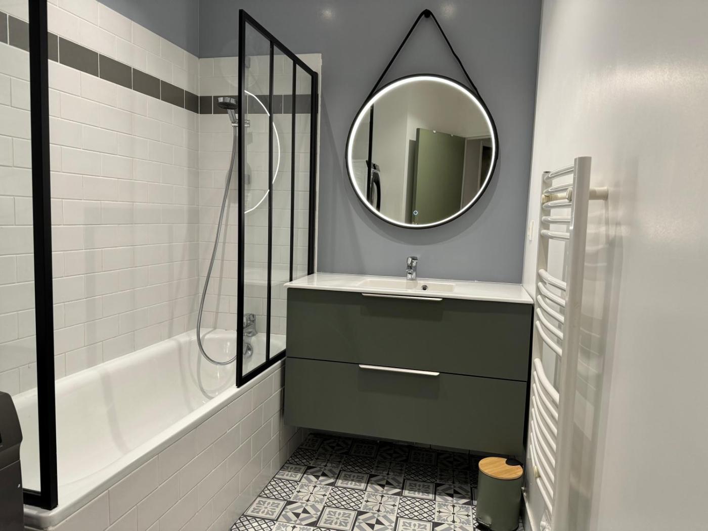 Appartement 1 Chambre. This apartment comes with 2 living rooms, 1 separate bedroom and 1 bathroom with a bath and a shower. The fully equipped kitchen has a stovetop, a refrigerator, a dishwasher and kitchenware. The apartment features a flat-screen TV with streaming services, a washing machine, a coffee machine, a seating area as well as city views. The unit has 2 beds.