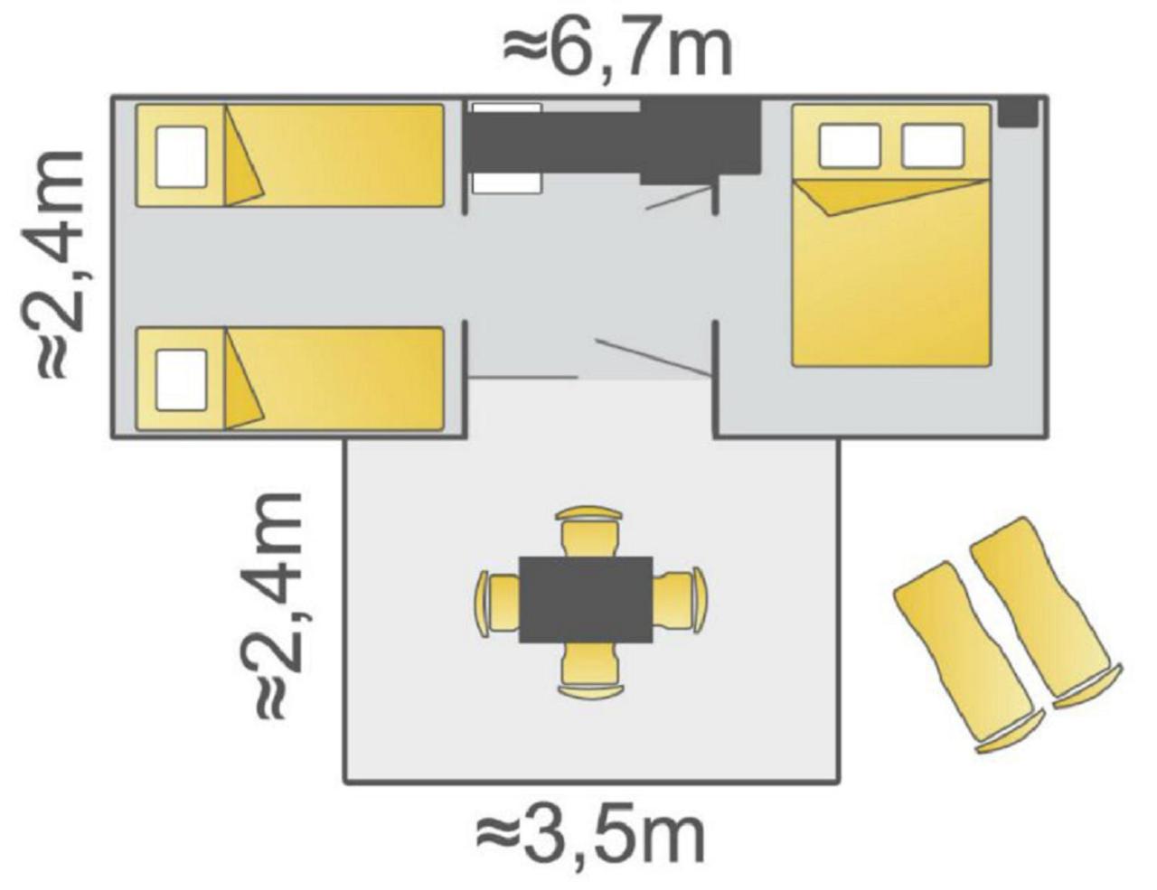 Mobile Home 2 Chambres (6 Adultes) avec Salle de Bains Commune. Bénéficiant dune entrée privée, ce mobile home dispose de 2 chambres, dune salle de bains et dune cuisine. Vous pourrez préparer vos repas et entreposer de la nourriture dans la cuisine équipée de plaques de cuisson, d’un réfrigérateur et d’ustensiles de cuisine. Ce mobile home dispose dune machine à café, dun coin repas, dune armoire et dune terrasse avec vue sur le jardin. Ce logement comprend 5 lits. ;
