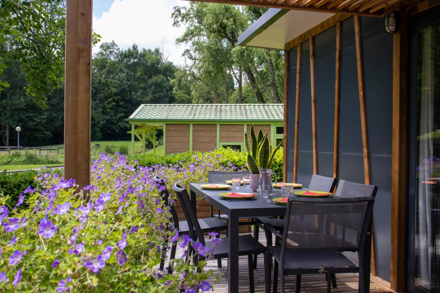 Mobile Home 2 Chambres Confort (4 Adultes). Doté dune terrasse, ce mobile home comprend 2 chambres, une salle de bains avec douche et une cuisine bien équipée. La cuisine bien équipée est munie de plaques de cuisson, d’un réfrigérateur, d’un micro-ondes et d’ustensiles. Cette chambre avec vue sur le jardin est doté d’une entrée indépendante, d’une machine à café, ainsi que de coins repas intérieur et extérieur. Ce logement comprend 3 lits. ;