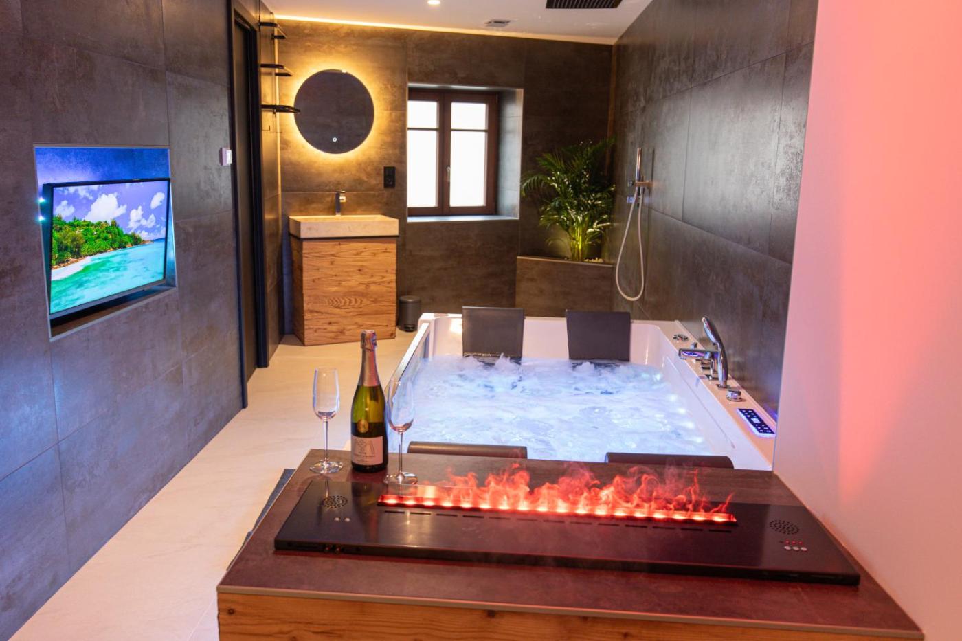 Appartement. This apartments special features are the hot tub and the spa bath. This apartment consists of 1 living room, 1 separate bedroom and 1 bathroom with a shower and free toiletries. In the well-equipped kitchen, guests will find a stovetop, a refrigerator, a dishwasher and kitchenware. The air-conditioned apartment provides a flat-screen TV, a tea and coffee maker, a dining area, a wardrobe as well as city views. The unit offers 1 bed. ;