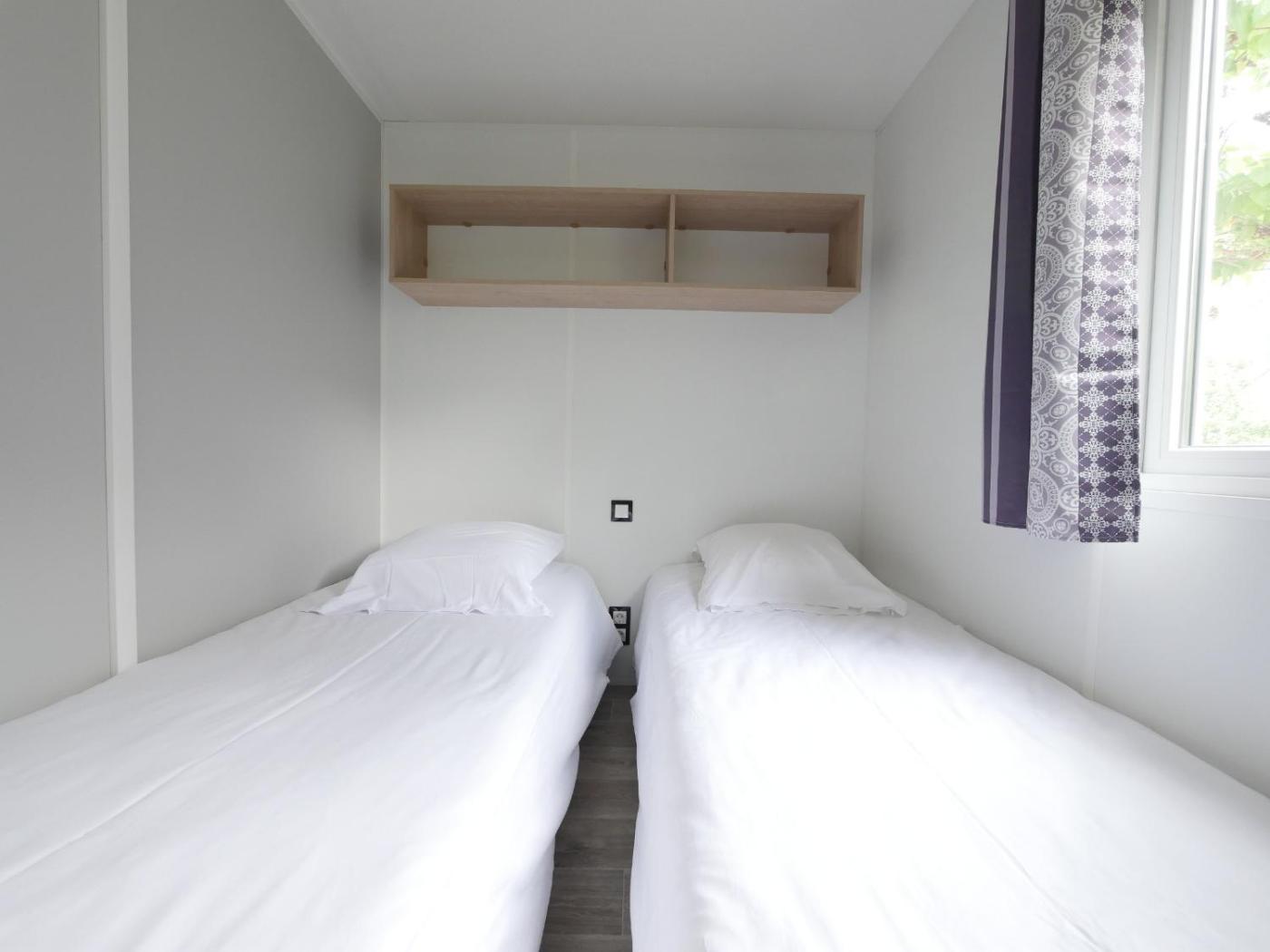 Mobile Home. This mobile home is comprised of 1 living room, 2 separate bedrooms and 1 bathroom with a shower. The mobile homes kitchen is available for cooking and storing food. The mobile home offers a seating area, a barbecue, heating, as well as a TV. The unit offers 3 beds.